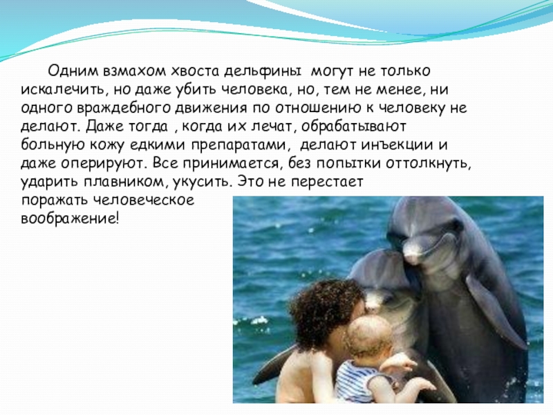 Слайд 5Одним взмахом хвоста дельфины могут не только искалечить, но даже убить