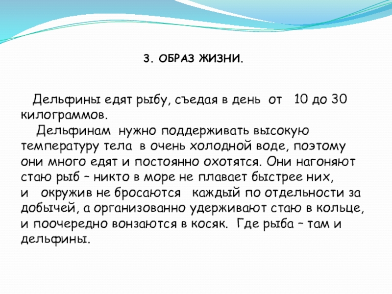 Дельфинам нужно поддерживать высокую температуру тела в очень холодной воде, поэтому они много едят и постоянно охотятся. Они нагоняют стаю рыб – никто в море не плавает быстрее них, и окружив не бросаются каждый по отдельности за добычей, а организованно удерживают стаю в кольце, и поочередно вонзаются в косяк. Где рыба – там и дельфины.
