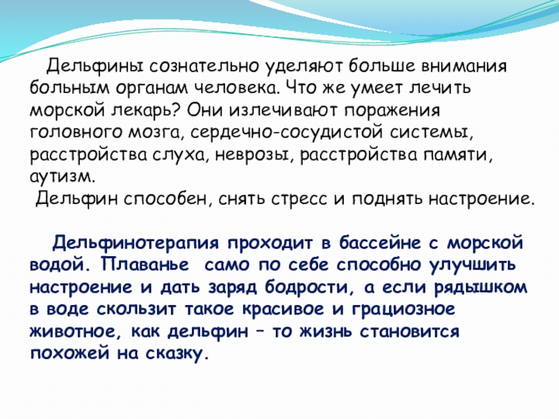 Рассказывая об этом удивительном животном, нельзя не сказать о лечении дельфинами