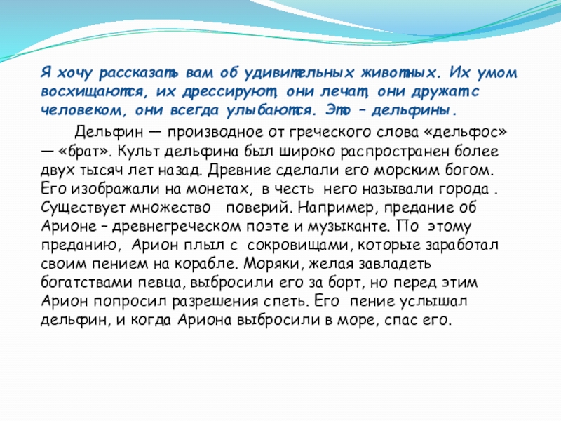 Дельфин — производное от греческого слова «дельфос» — «брат». Культ дельфина был широко распространен более двух тысяч лет назад. Древние сделали его морским богом. Его изображали на монетах, в честь него называли города . Существует множество поверий. Например, предание об Арионе – древнегреческом поэте и музыканте. По этому преданию, Арион плыл с сокровищами, которые заработал своим пением на корабле. Моряки, желая завладеть богатствами певца, выбросили его за борт, но перед этим Арион попросил разрешения спеть. Его пение услышал дельфин, и когда Ариона выбросили в море, спас его.