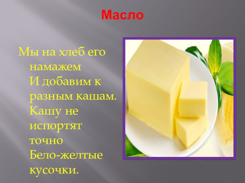 Масло Мы на хлеб его намажем И добавим к разным кашам. Кашу не испортят точно Бело-желтые кусочки.