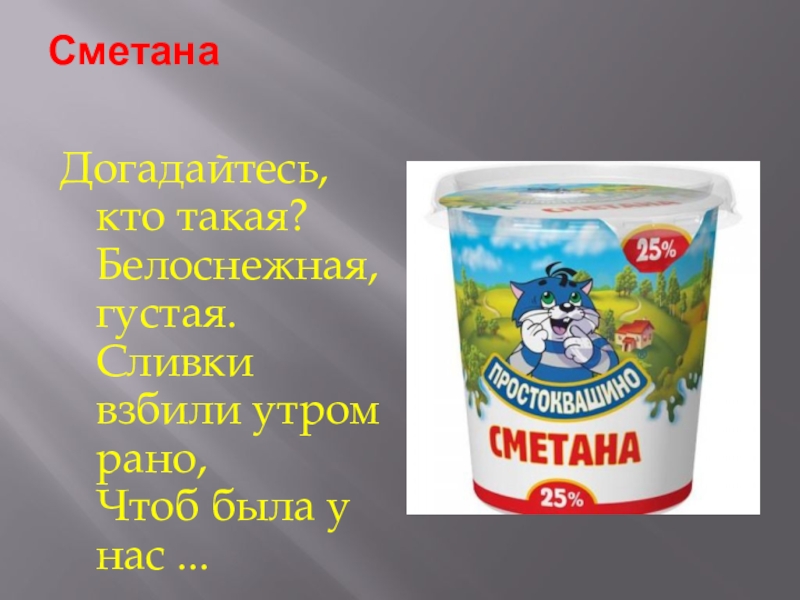 Сметана Догадайтесь, кто такая? Белоснежная, густая. Сливки взбили утром рано, Чтоб была у нас ...
