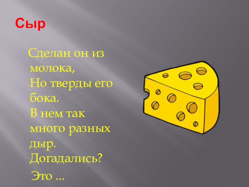 Сыр  Сделан он из молока, Но тверды его бока. В нем так много разных дыр. Догадались?