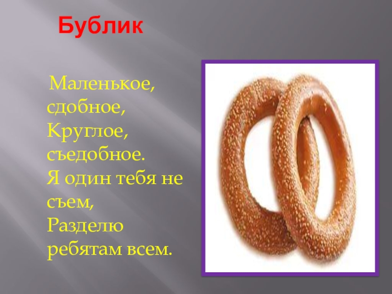 Бублик   Маленькое, сдобное, Круглое, съедобное. Я один тебя не съем, Разделю ребятам всем.
