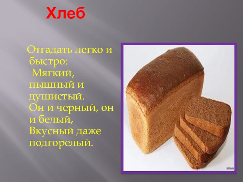 Хлеб   Отгадать легко и быстро:  Мягкий, пышный и душистый. Он и черный, он и