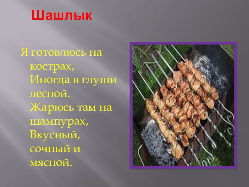 Шашлык  Я готовлюсь на кострах, Иногда в глуши лесной. Жарюсь там на шампурах, Вкусный, сочный и