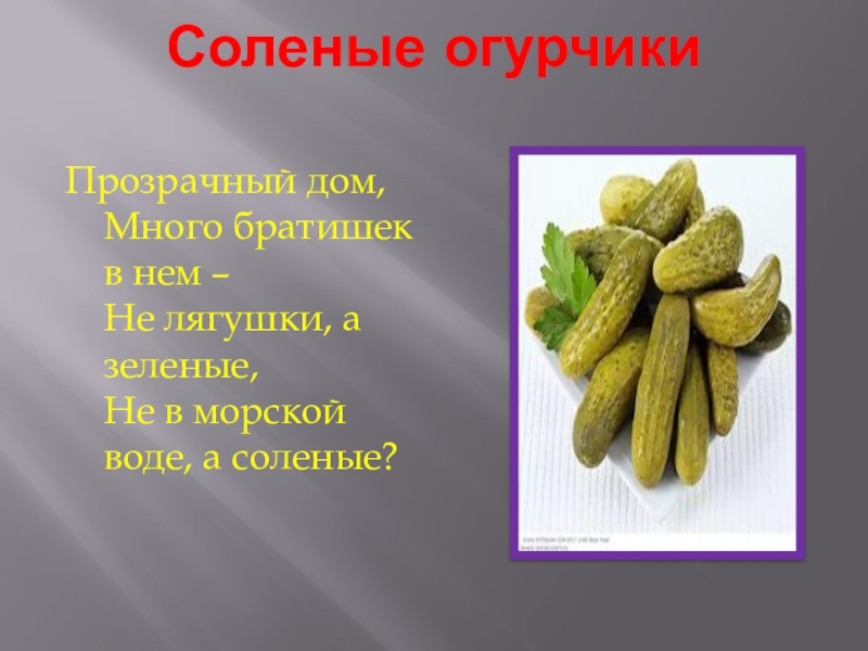 Соленые огурчики Прозрачный дом, Много братишек в нем – Не лягушки, а зеленые, Не в морской воде,