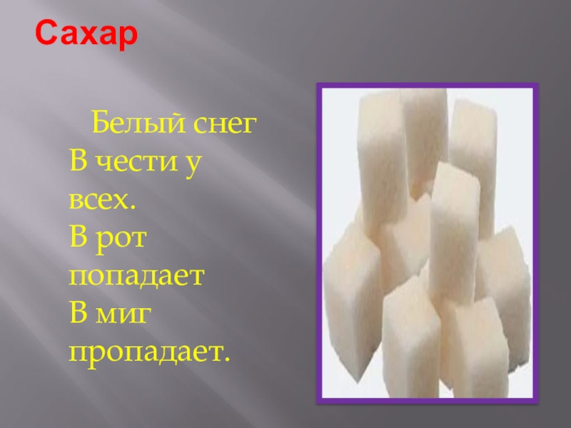 Сахар Белый снег В чести у всех. В рот попадает В миг пропадает.