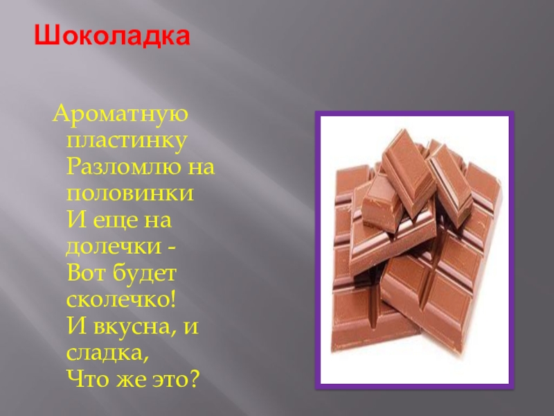 Шоколадка  Ароматную пластинку Разломлю на половинки И еще на долечки - Вот будет сколечко! И вкусна,