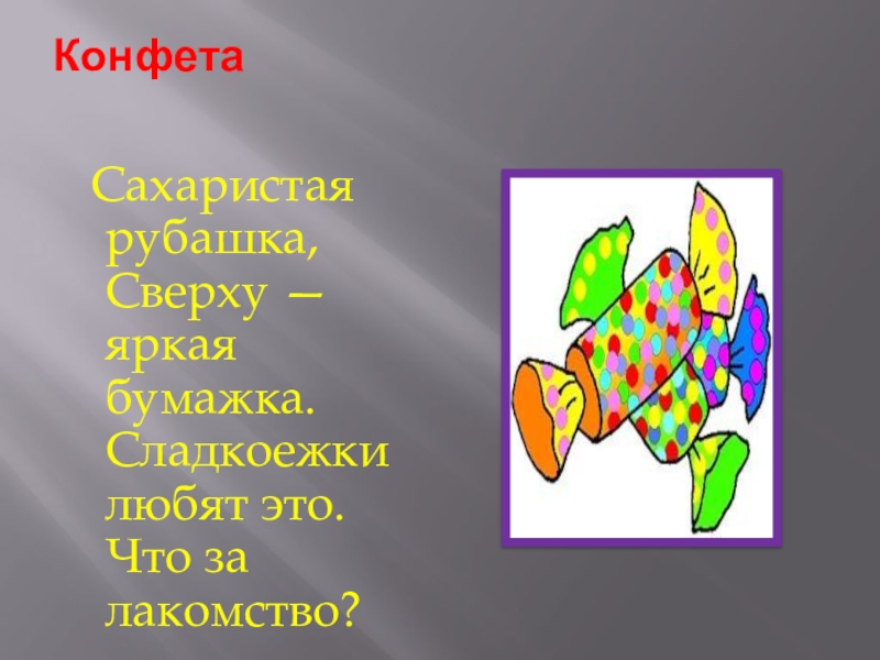 Конфета  Сахаристая рубашка, Сверху — яркая бумажка. Сладкоежки любят это. Что за лакомство?