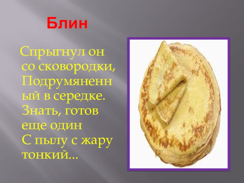 Блин   Спрыгнул он со сковородки, Подрумяненный в середке. Знать, готов еще один С пылу