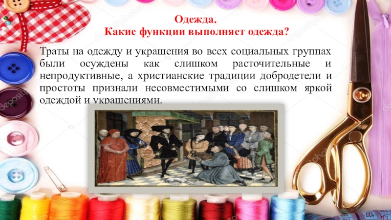 социальных группах были осуждены как слишком расточительные и непродуктивные, а христианские традиции добродетели и простоты признали несовместимыми со слишком яркой одеждой и украшениями.