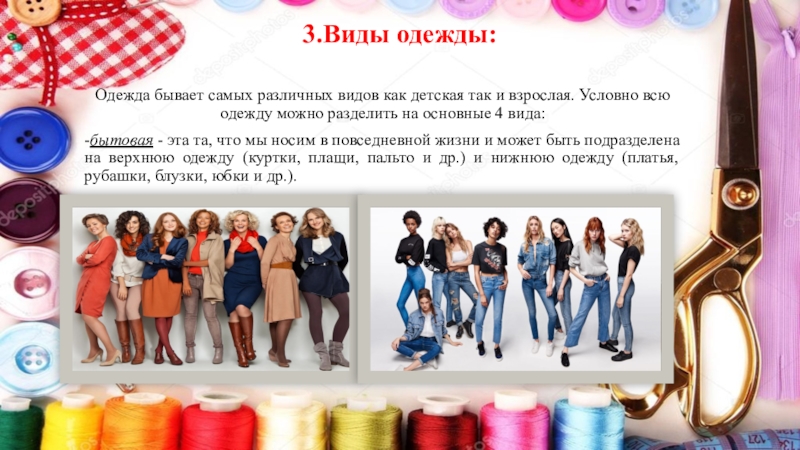 -бытовая - эта та, что мы носим в повседневной жизни и может быть подразделена на верхнюю одежду (куртки, плащи, пальто и др.) и нижнюю одежду (платья, рубашки, блузки, юбки и др.).
