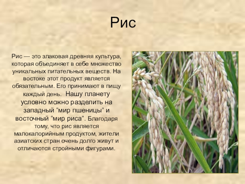 уникальных питательных веществ. На востоке этот продукт является обязательным. Его принимают в пищу каждый день. Нашу планету условно можно разделить на западный “мир пшеницы” и восточный “мир риса”. Благодаря тому, что рис является малокалорийным продуктом, жители азиатских стран очень долго живут и отличаются стройными фигурами.