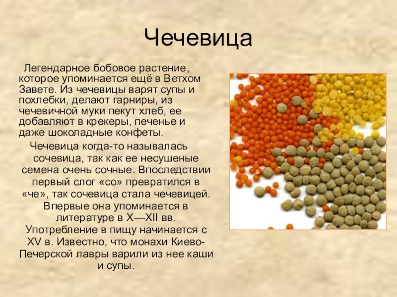 Чечевица когда-то называлась сочевица, так как ее несушеные семена очень сочные. Впоследствии первый слог «со» превратился в «че», так сочевица стала чечевицей. Впервые она упоминается в литературе в X—XII вв. Употребление в пищу начинается с XV в. Известно, что монахи Киево-Печерской лавры варили из нее каши и супы.