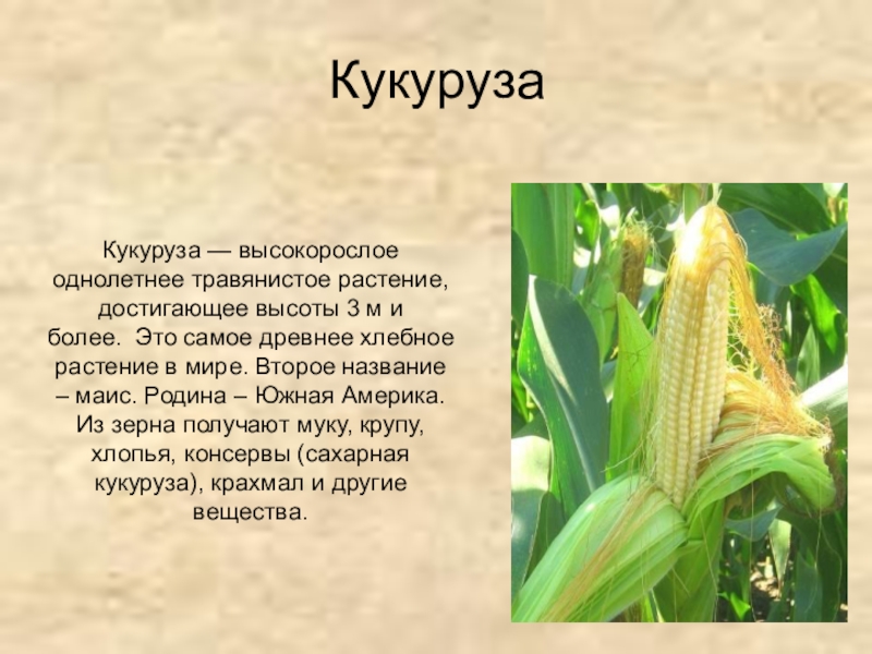 древнее хлебное растение в мире. Второе название – маис. Родина – Южная Америка. Из зерна получают муку, крупу, хлопья, консервы (сахарная кукуруза), крахмал и другие вещества.