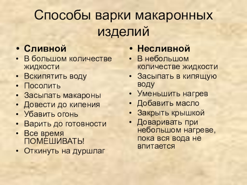 Сейчас макаронные фабрики вырабатывают из различных сортов пшеничной муки разные виды макаронных изделий: трубчатые, макаронные засыпки, вермишель.