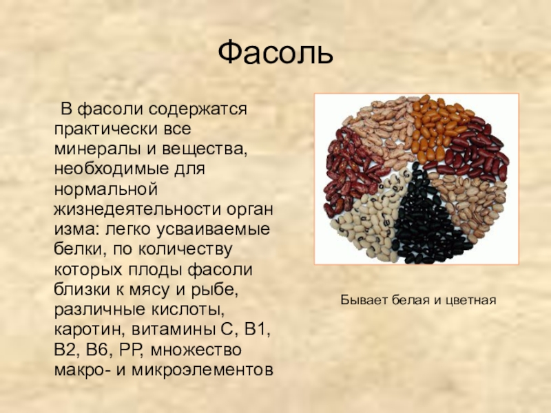 жизнедеятельности организма: легко усваиваемые белки, по количеству которых плоды фасоли близки к мясу и рыбе, различные кислоты, каротин, витамины С, B1, В2, В6, РР, множество макро- и микроэлементов