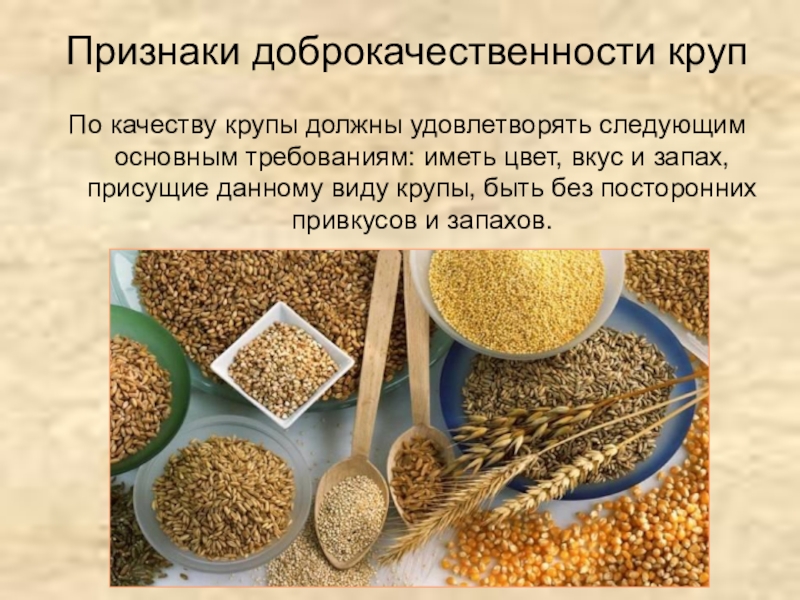 Слайд 23По качеству крупы должны удовлетворять следующим основным требованиям: иметь цвет, вкус