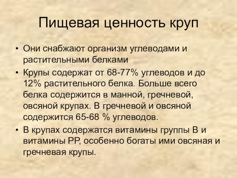 68-77% углеводов и до 12% растительного белка. Больше всего белка содержится в манной, гречневой, овсяной крупах. В гречневой и овсяной содержится 65-68 % углеводов.