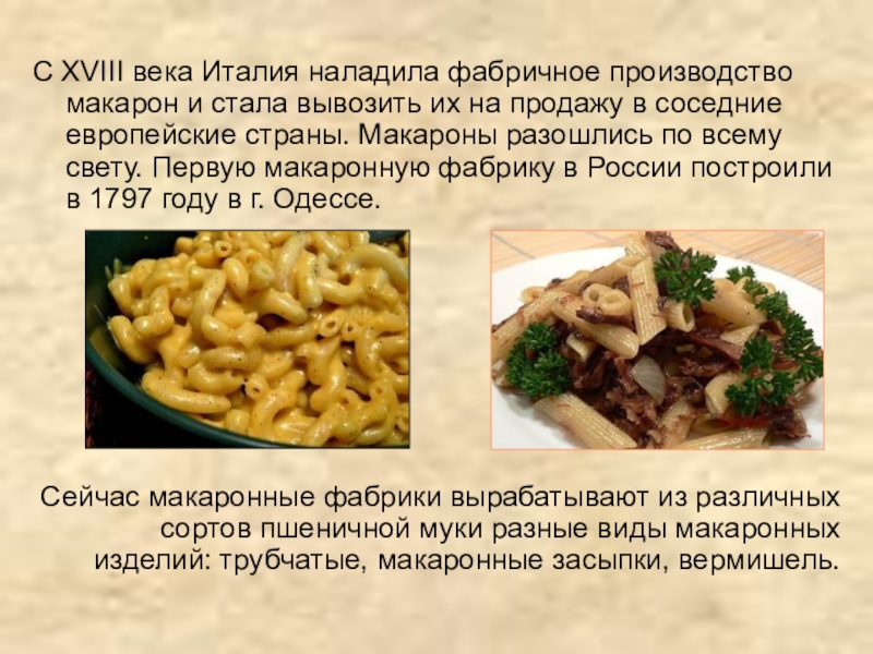 их на продажу в соседние европейские страны. Макароны разошлись по всему свету. Первую макаронную фабрику в России построили в 1797 году в г. Одессе.