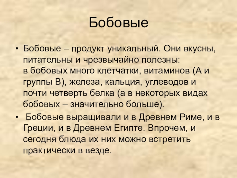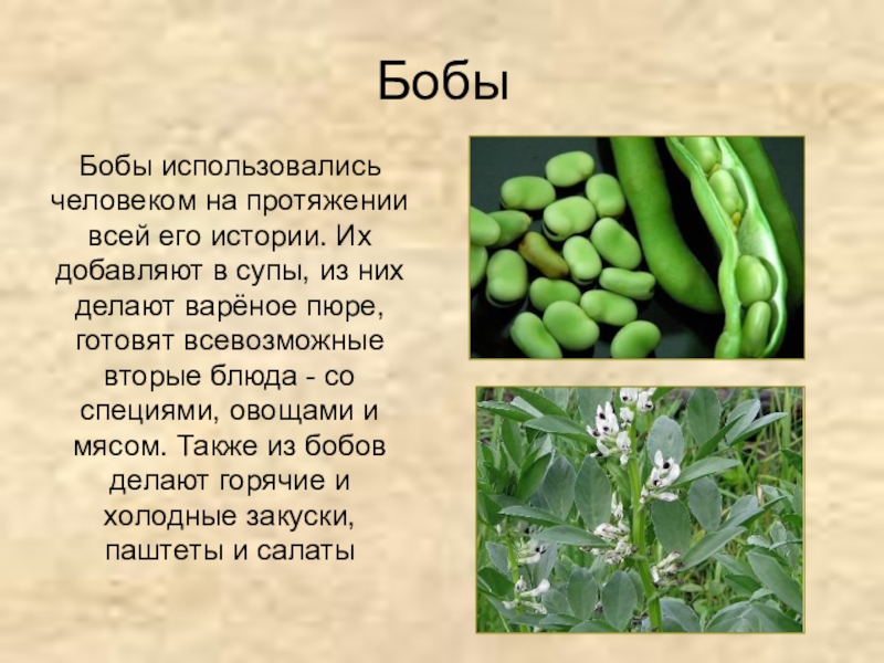 Бобы использовались человеком на протяжении всей его истории. Их добавляют в