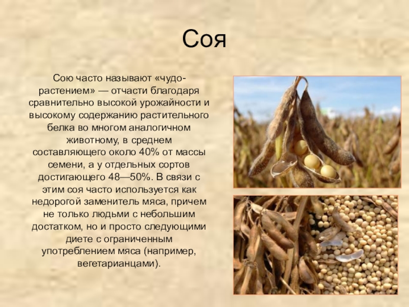 содержанию растительного белка во многом аналогичном животному, в среднем составляющего около 40% от массы семени, а у отдельных сортов достигающего 48—50%. В связи с этим соя часто используется как недорогой заменитель мяса, причем не только людьми с небольшим достатком, но и просто следующими диете с ограниченным употреблением мяса (например, вегетарианцами).