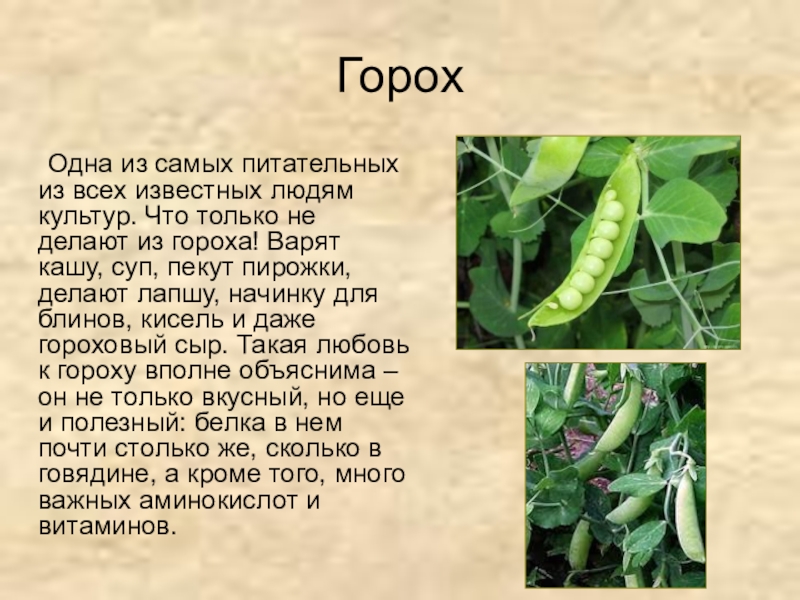 не делают из гороха! Варят кашу, суп, пекут пирожки, делают лапшу, начинку для блинов, кисель и даже гороховый сыр. Такая любовь к гороху вполне объяснима – он не только вкусный, но еще и полезный: белка в нем почти столько же, сколько в говядине, а кроме того, много важных аминокислот и витаминов.