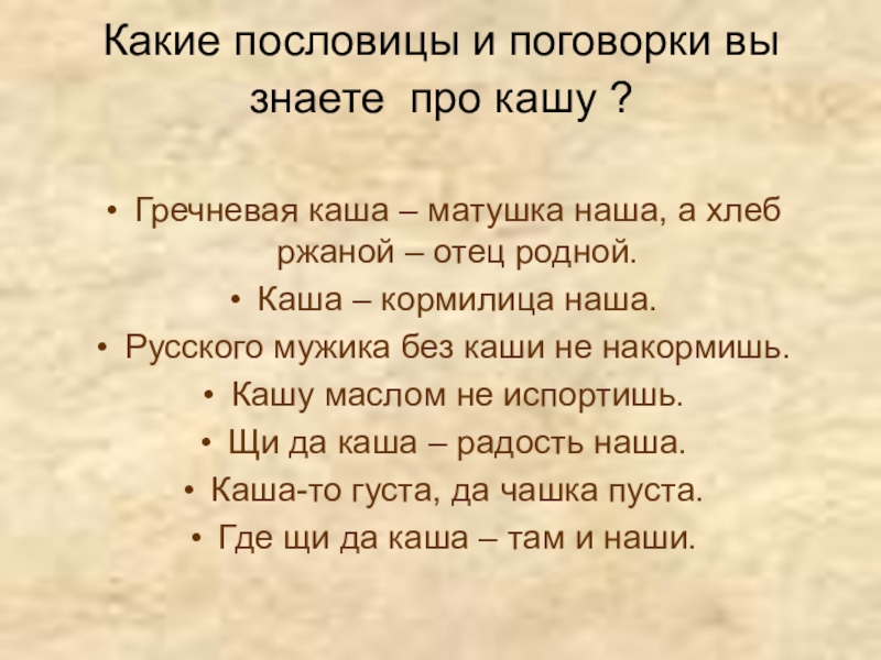 Слайд 26Какие пословицы и поговорки вы знаете про кашу ?