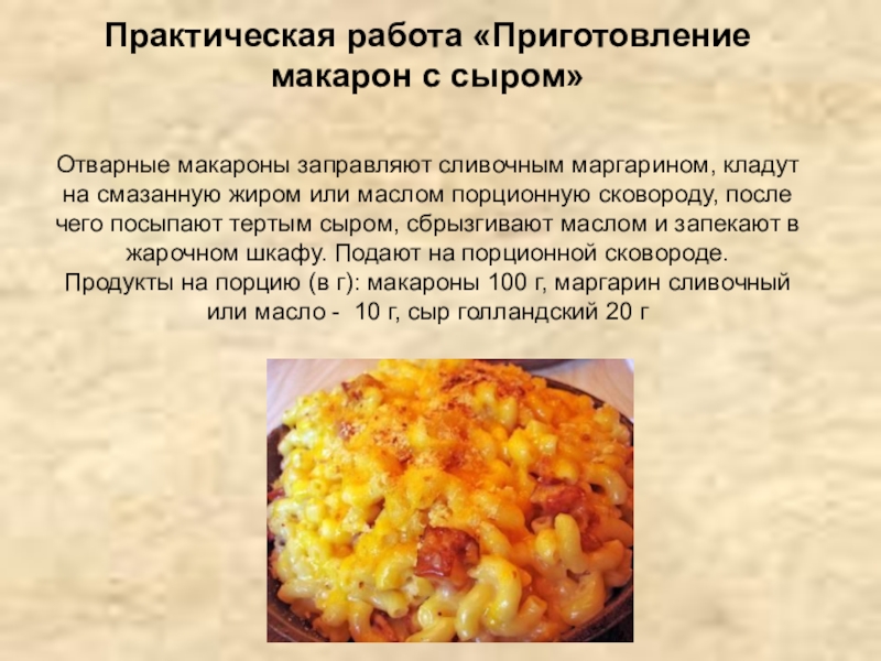 Продукты на порцию (в г): макароны 100 г, маргарин сливочный
