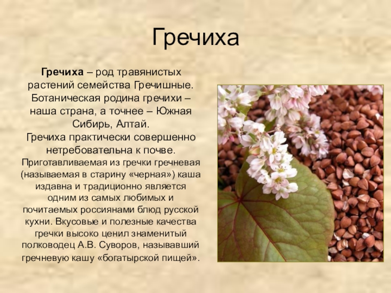 Гречиха практически совершенно нетребовательна к почве. Приготавливаемая из гречки гречневая (называемая в старину «черная») каша издавна и традиционно является одним из самых любимых и почитаемых россиянами блюд русской кухни. Вкусовые и полезные качества гречки высоко ценил знаменитый полководец А.В. Суворов, называвший гречневую кашу «богатырской пищей».