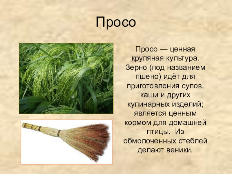 Просо — ценная крупяная культура. Зерно (под названием пшено) идёт для приготовления