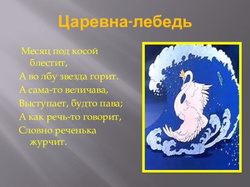 Царевна-лебедь  Месяц под косой блестит,А во лбу звезда горит.А сама-то величава,Выступает, будто пава;А как речь-то