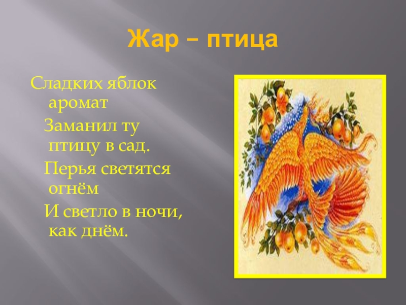 Жар – птицаСладких яблок аромат   Заманил ту птицу в сад.   Перья светятся огнём   И светло в ночи,