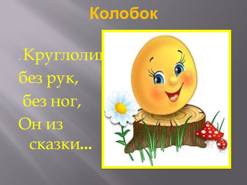 Колобок . Круглолиц,без рук, без ног,Он из сказки...