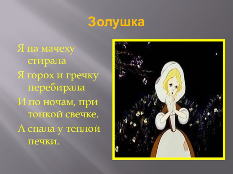 ЗолушкаЯ на мачеху стиралаЯ горох и гречку перебиралаИ по ночам, при тонкой свечке.А спала у теплой печки.