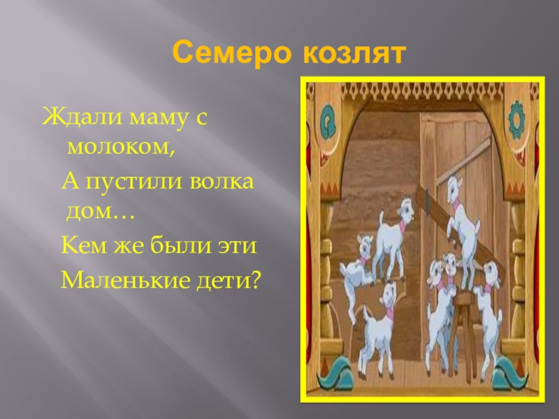 Семеро козлятЖдали маму с молоком,   А пустили волка дом…   Кем же были эти   Маленькие дети?
