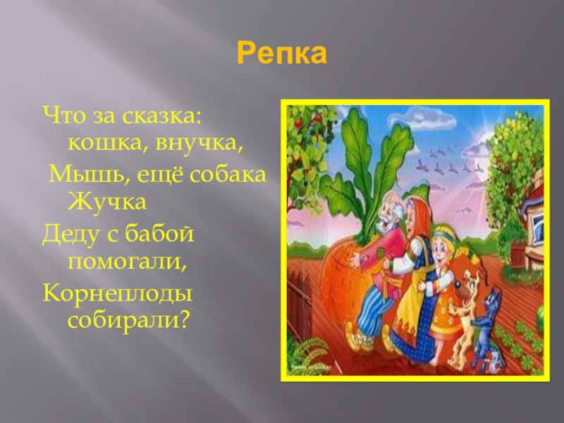 РепкаЧто за сказка: кошка, внучка, Мышь, ещё собака ЖучкаДеду с бабой помогали,Корнеплоды собирали?