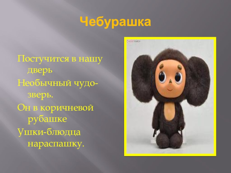 ЧебурашкаПостучится в нашу дверьНеобычный чудо-зверь.Он в коричневой рубашкеУшки-блюдца нараспашку.