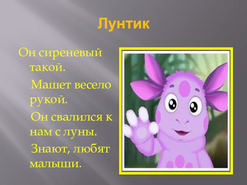 ЛунтикОн сиреневый такой.    Машет весело рукой.    Он свалился к нам с луны.    Знают, любят