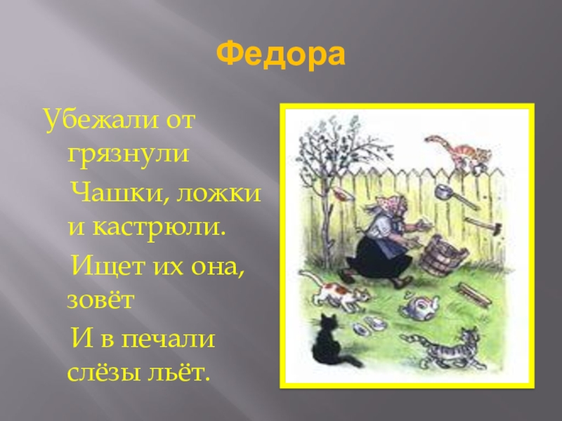 ФедораУбежали от грязнули    Чашки, ложки и кастрюли.    Ищет их она, зовёт    И в печали