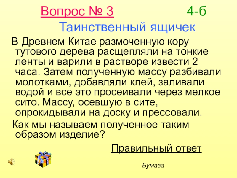 В Древнем Китае размоченную кору тутового дерева расщепляли на тонкие ленты и варили в растворе извести 2 часа. Затем полученную массу разбивали молотками, добавляли клей, заливали водой и все это просеивали через мелкое сито. Массу, осевшую в сите, опрокидывали на доску и прессовали.