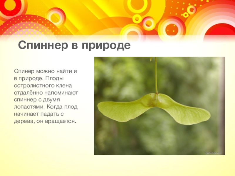 Спиннер в природеСпинер можно найти и в природе. Плоды остролистного клена отдалённо напоминают спиннер с двумя лопастями.