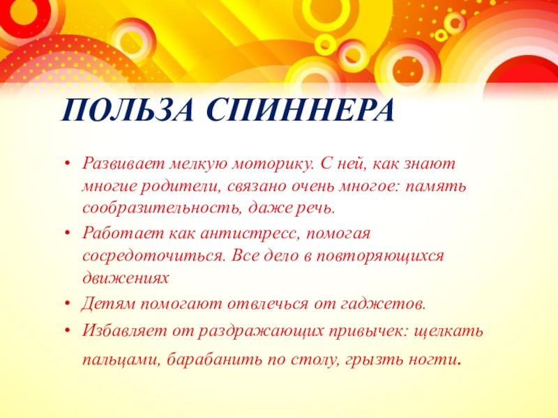 ПОЛЬЗА СПИННЕРАРазвивает мелкую моторику. С ней, как знают многие родители, связано очень многое: память сообразительность, даже речь.Работает