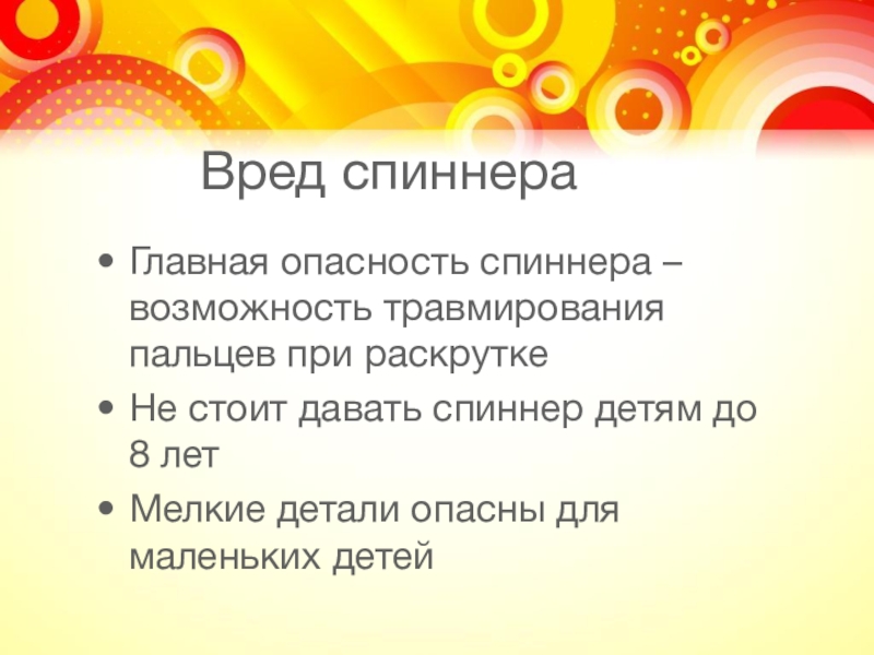 Вред спиннераГлавная опасность спиннера – возможность травмирования пальцев при раскруткеНе стоит давать спиннер
