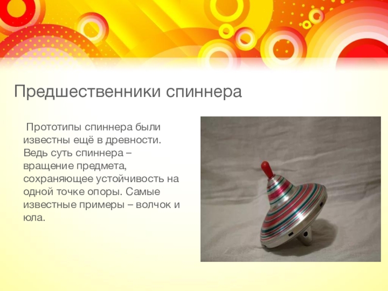 древности. Ведь суть спиннера – вращение предмета, сохраняющее устойчивость на одной точке опоры. Самые известные примеры – волчок и юла.