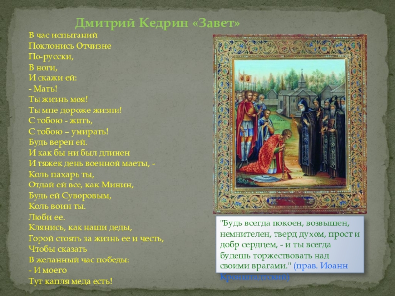 "Будь всегда покоен, возвышен, немнителен, тверд духом, прост и добр сердцем, - и ты всегда будешь торжествовать над своими врагами." (прав. Иоанн Кронштадтский)
