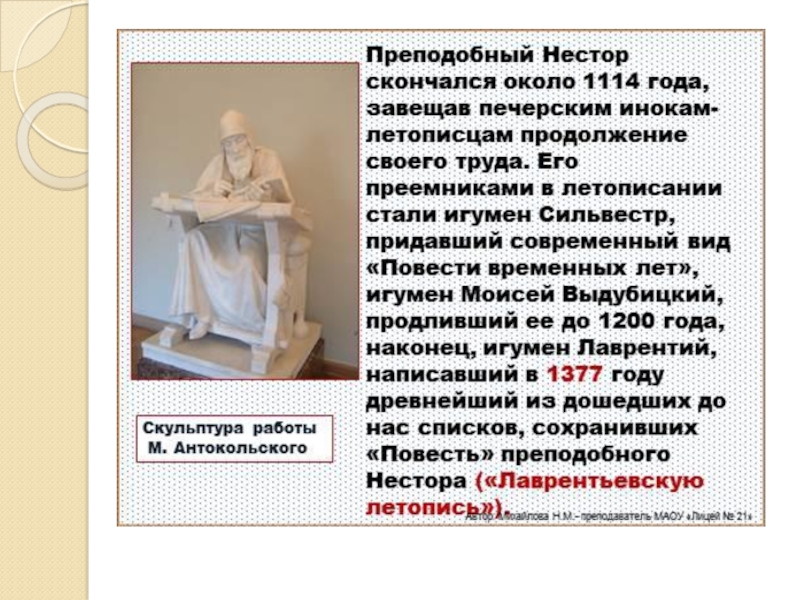 Презентация, доклад по внеурочной деятельности (Клуб юных историков) Летописец Нестор