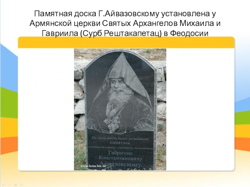 Слайд 16Памятная доска Г.Айвазовскому установлена у Армянской церкви Святых Архангелов Михаила и