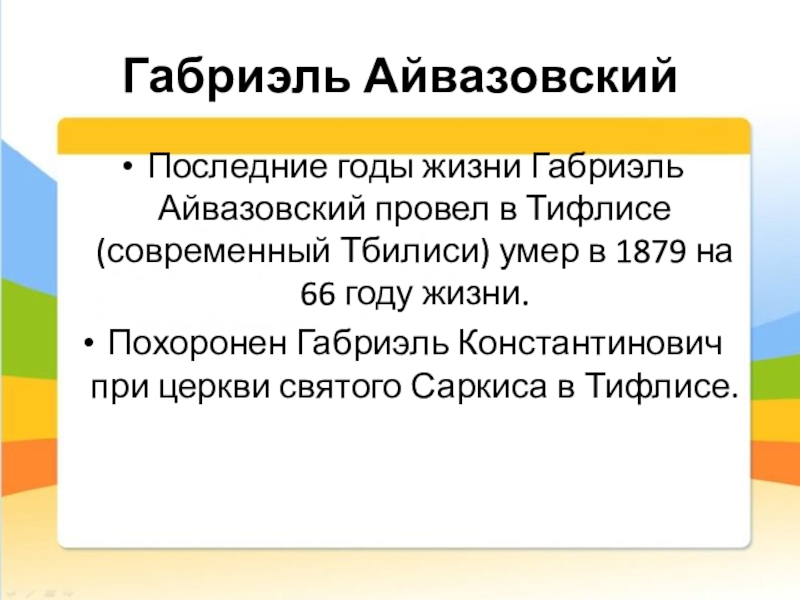 Последние годы жизни Габриэль Айвазовский провел в Тифлисе (современный Тбилиси)